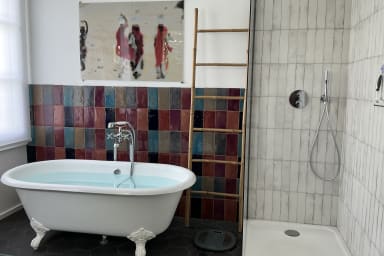 Bedroom 1: double bed (180 cm), en-suite shower room with sink