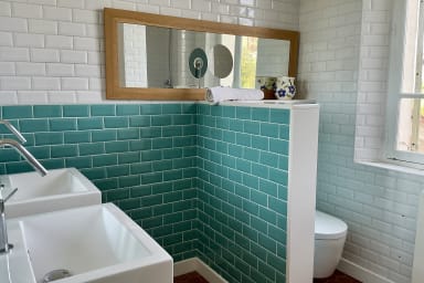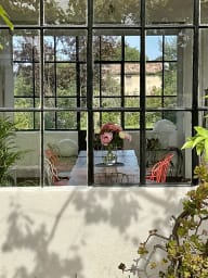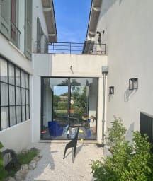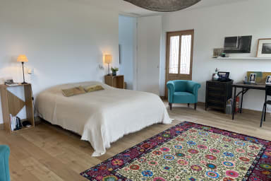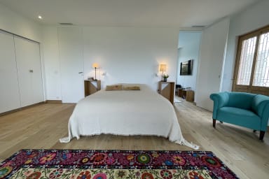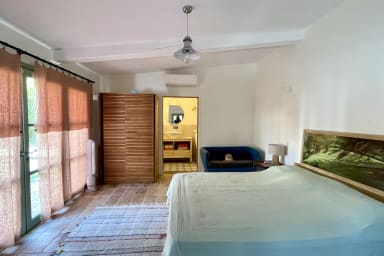 The main house is organized around several elegant and welcoming living areas. Upon entering, you will find guest toilets, a laundry room, and a spacious fully equipped kitchen, ideal for entertaining, featuring a range cooker, double dishwasher, and a large dining table.