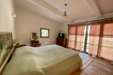 Master suite (Bedroom 2): double bed (180 cm), adjoining office with TV, full bathroom (bathtub, shower, WC) with pool view, access to a private terrace